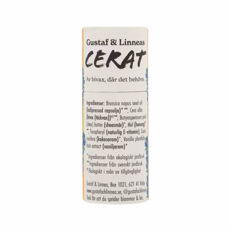 Plastförpackningen har valts bort till förmån för en högtålig och miljövänligare pappförpackning i vacker design av klarröd Vallmo, en klassisk gotländsk vy och en blomfavorit hos bina med sitt höga pollenvärde. Dessutom har storleken fördubblats jämfört med ett vanligt cerat, vilket gör det lätt att applicera där det behövs. Varje cerat är tillverkat för hand med omsorg på Gotland av ett litet familjeföretag med passion för hållbarhet. När du håller det här ceratet i din hand har du inte bara det bästa för din hud och dina läppar, du bidrar också till att sprida blommor och bin för ett välfungerande ekosystem.