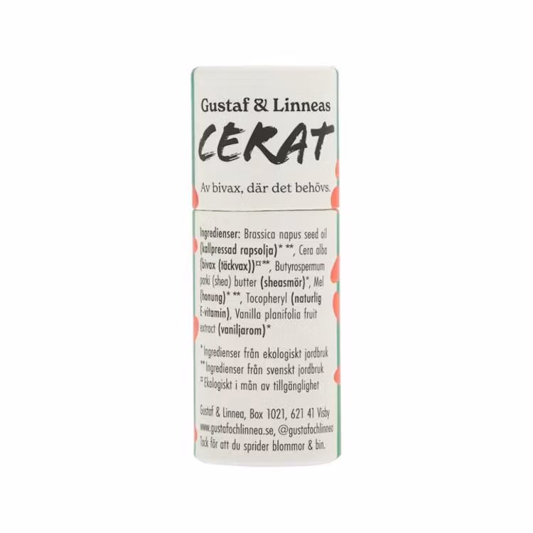 Ett silkeslent cerat som skönt mjukar upp och återfuktar din hud och dina läppar. Skapat av bivax och honung från bin som flugit över den svenska floran. Tillsammans med kallpressad gotländsk rapsolja, vårdande sheasmör och en touch av vaniljarom har du något riktigt bra för nariga läppar, torra händer eller väderbitna kinder.