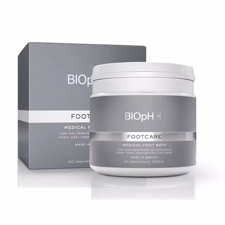 BIOpH Footcare fotbad djuprengör, exfolierar och tar bort döda hudceller och skapar därmed en ogynnsam miljö för bakterier, virus och svamp på huden.