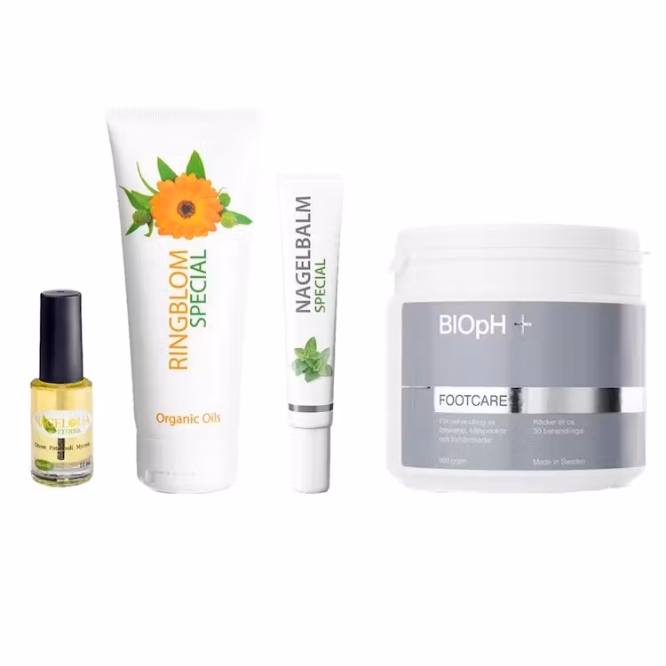 Nu kan du ta del av mitt erbjudande med en Nagelbalm Special som håller dina naglar friska och en Ringblom Special som är superbra för torr och narig hud. BIOpH Footcare är ett fotbad som gör under med era fötter. Avsluta behandlingen med att använda Nagelola Esterisk för att stärka och ljusa upp dina naglar.