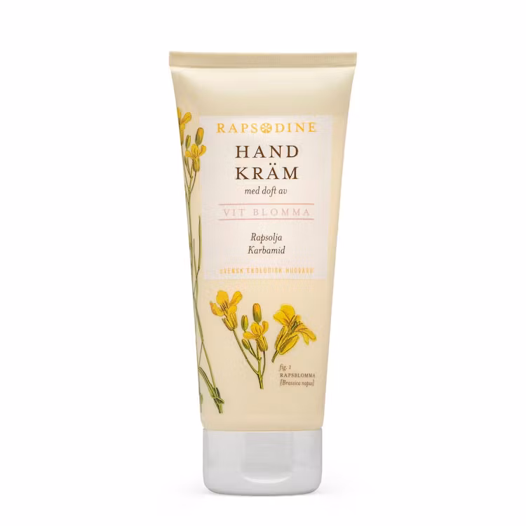 Rapsodines handkräm är baserad på svensk ekologisk rapsolja med sina unika mjukgörande, återfuktande och återfettande egenskaper. Rapsoljan är kallpressad, den tas lätt upp av huden och tillför näringsämnen i form av vitaminer, mineraler och hälsosamma fettsyror. Krämen skyddar, mjukgör och förebygger problem med torr hud. Innehåller karbamid och har en lång fuktighetsbevarande verkan.