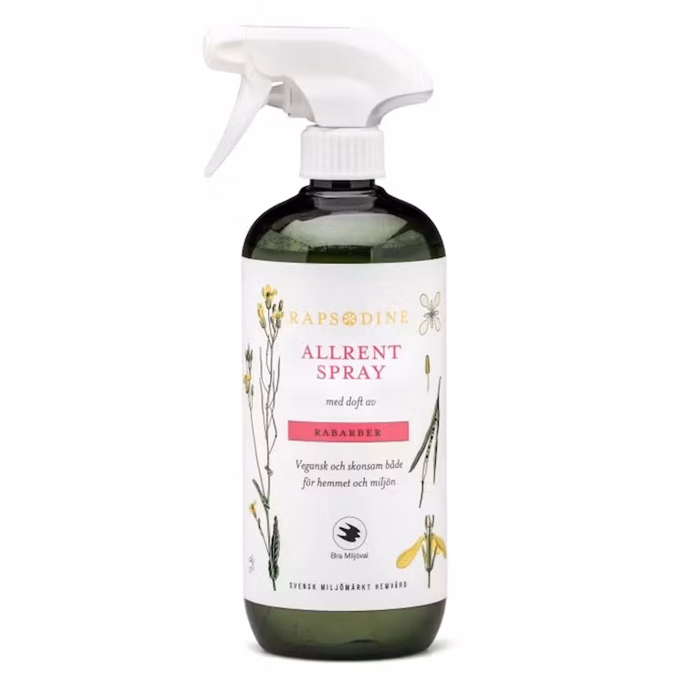 Märkt med Bra Miljöval och flaska i 100 % återvunnen plast.Rapsodine Allrent spray är ett effektivt allrengöringsmedel. Produkten uppfyller hårda krav på biologisk nedbrytbarhet och har en dryg formulering med mycket goda fett-, och smutslösande egenskaper. Med mild doft av rabarber.Tillverkat i ett modellområde för Hållbar utveckling, i biosfärområde Vänerskärgården med Kinnekulle.DOSERING: Spraya ett tunt lager på ytan du vill rengöra och torka rent med trasa eller svamp. Tänk på miljön, överdosera inte.